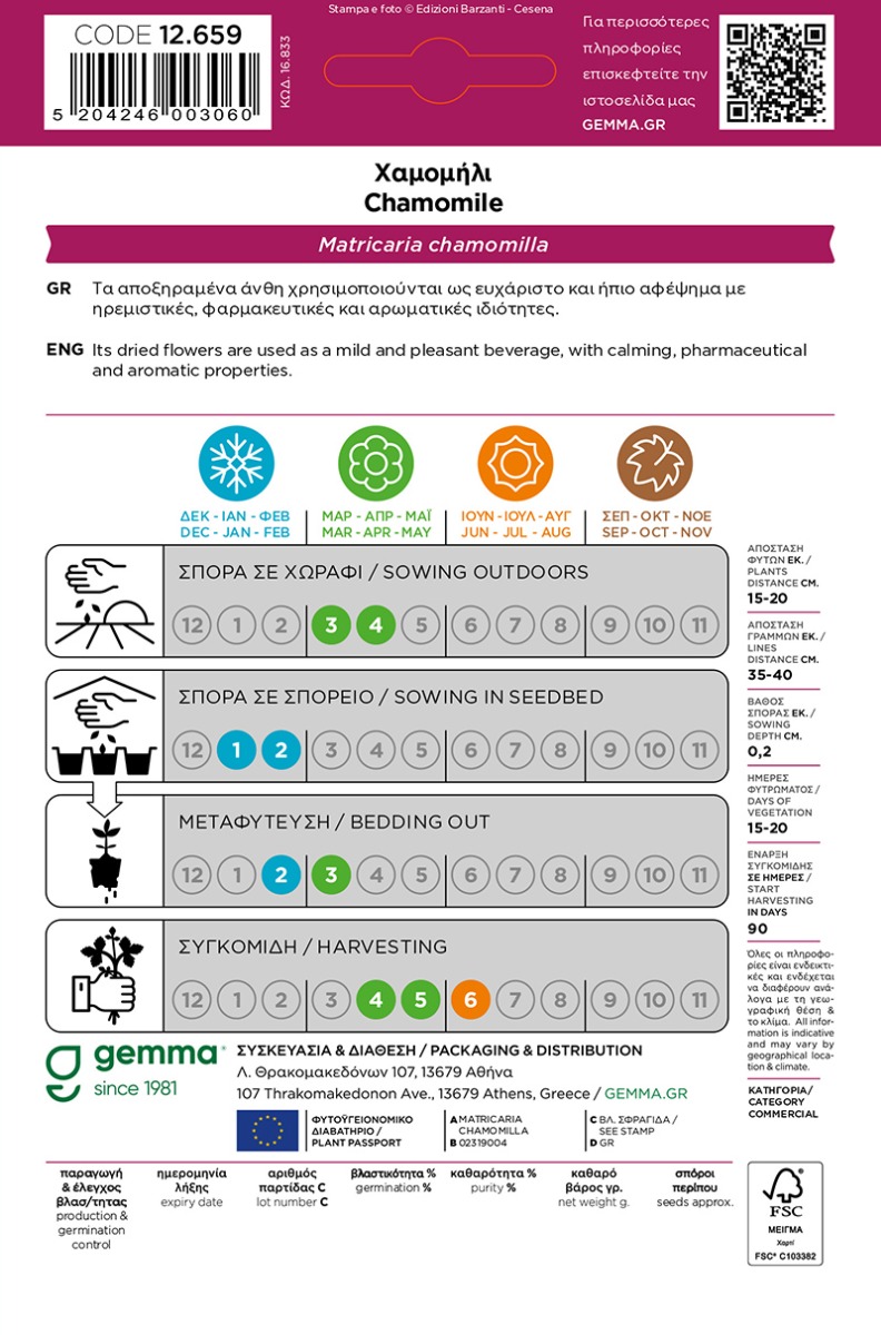 πιο αφέψημα. Πολυετές. Tα αποξηραμένα άνθη χρησιμοποιούνται ως ευχάριστο και ήπιο αφέψημα με ηρεμιστικές, φαρμακευτικές και αρωματικές ιδιότητες. Απόσταση φυτών (εκ.): 15-20. Απόσταση γραμμών (εκ.): 35-40. Βάθος σποράς (εκ.):0,2. Ημέρες φυτρώματος: 15-20. Έναρξη συγκομιδής (ημέρες): 90. Matricaria chamomilla. 0055