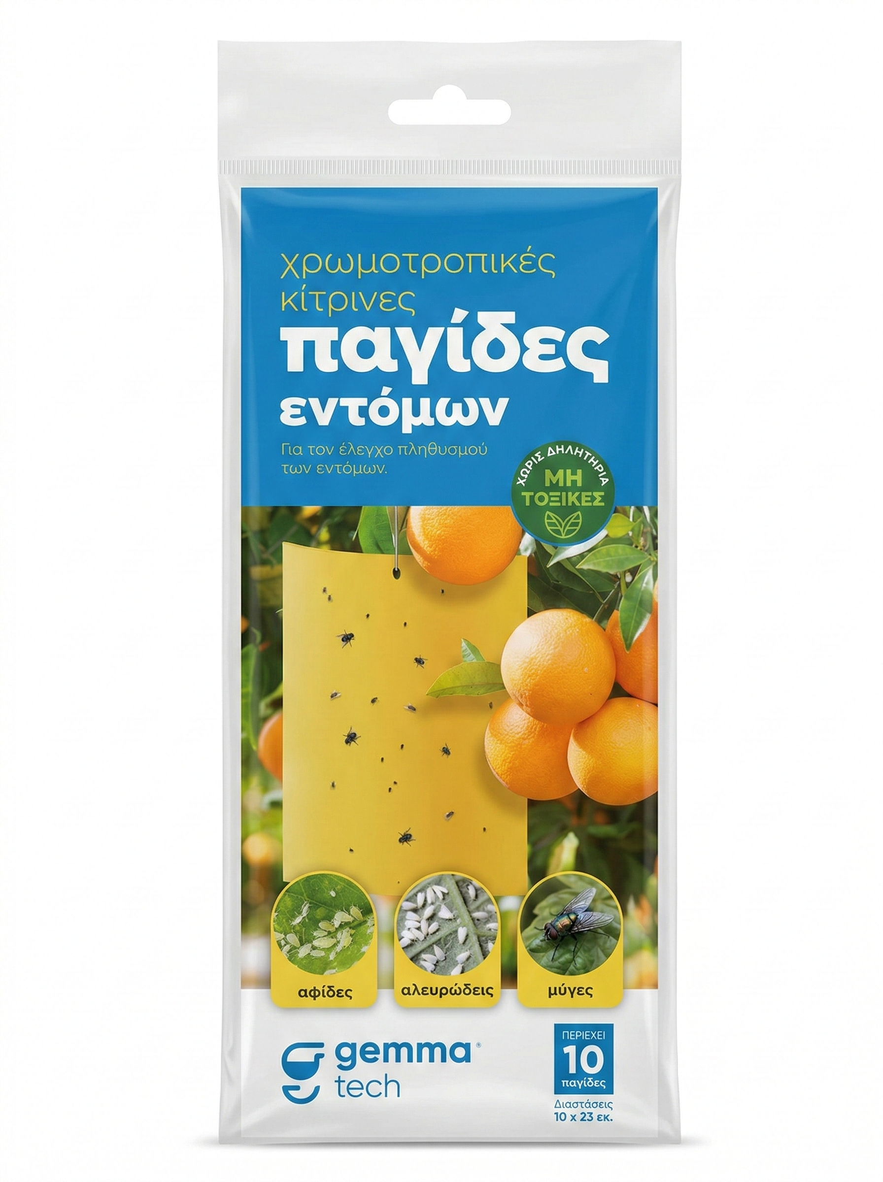 Η χρωμοτροπική κίτρινου χρώματος είναι ένα κολλώδες πάνελ που μπορεί να παγιδεύσει ενοχλητικά έντομα των καλλιεργειών. Δεν περιέχει τοξικές ουσίες, δεν ρυπαίνει, είναι ανθεκτική στην υγρασία και τις καιρικές συνθήκες. Είναι άοσμη και καταπολεμά έντομα όπως αφίδες, μύγες, κουνούπια κτλ. Ιδανικό μέσο προστασίας στον κήπο, το θερμοκήπιο ή το μπαλκόνι.