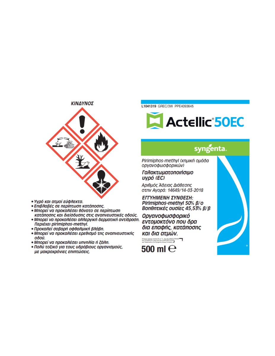Το ACTELLIC 50EC είναι οργανοφωσφορικό εντομοκτόνο που δρά δια επαφής, κατάποσης και δια ατμών για την καταπολέμηση εντόμων σε σπόρους σιτηρών και άδειες αποθήκες σιτηρών.