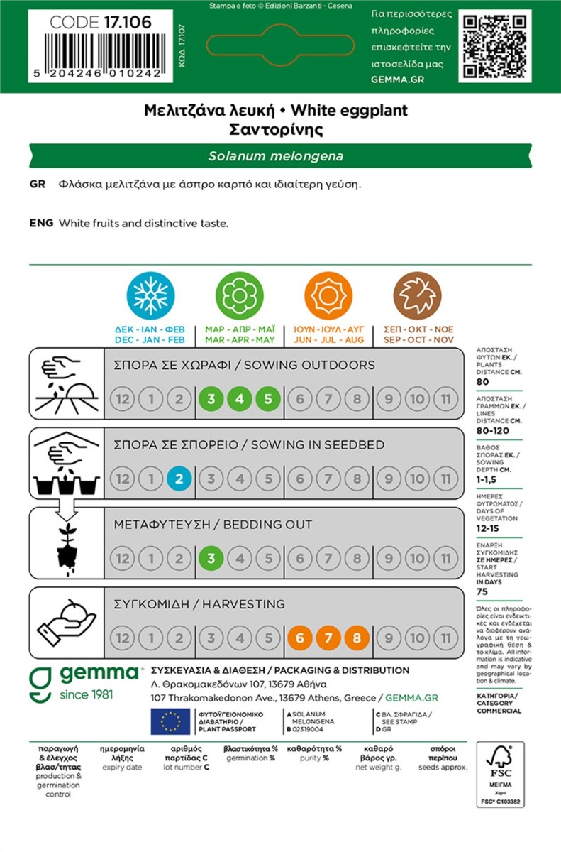 Μονοετές. Φλάσκα μελιτζάνα με άσπρο καρπό και ιδιαίτερη γεύση. Απόσταση φυτών (εκ.): 80. Απόσταση γραμμών (εκ.): 80-120. Βάθος σποράς (εκ.):1-1,5. Ημέρες φυτρώματος: 12-15. Έναρξη συγκομιδής (ημέρες): 75. Σαντορίνης.