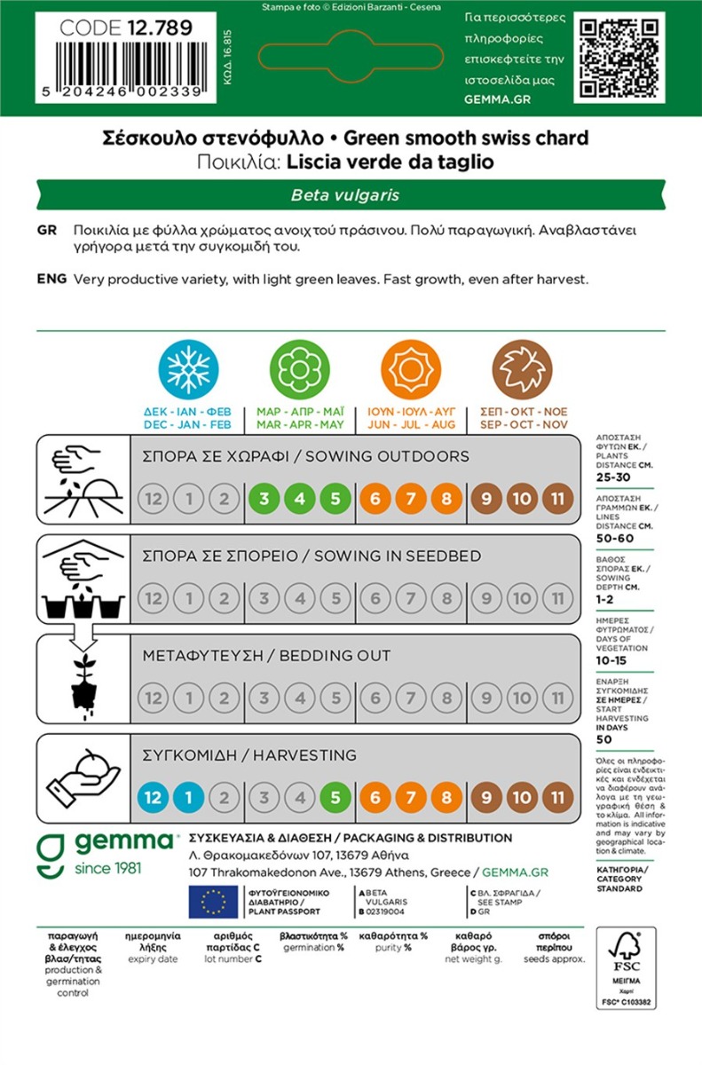 Γρήγορη αναβλάστηση. Μονοετές. Ποικιλία με φύλλα χρώματος ανοιχτού πράσινου. Πολύ παραγωγική. Αναβλαστάνει γρήγορα μετά την συγκομιδή του. Απόσταση φυτών (εκ.): 25-30. Απόσταση γραμμών (εκ.): 50-60. Βάθος σποράς (εκ.):1-2. Ημέρες φυτρώματος: 10-15. Έναρξη συγκομιδής (ημέρες): 50. Ποικιλία: Liscia verde da taglio. 0361