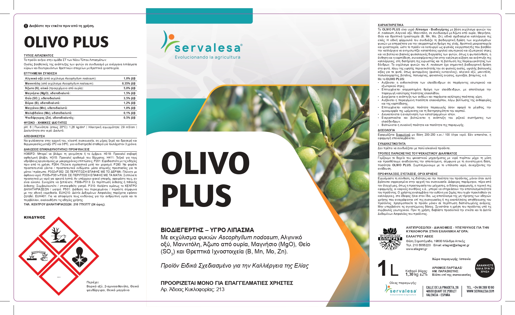 Το OLIVO PLUS είναι Βιοδιεγέρτης – Υγρό λίπασμα με βάση εκχύλισμα φυκιών του Ascophyllum nodosum, Αλγινικό οξύ και Μαννιτόλη, σε συνδυασμό με Άζωτο (προερχόμενο από ουρία), Μαγνήσιο (MgO), Θείο (SO3) και Θρεπτικά Ιχνοστοιχεία (Β, Μn, Μο, Ζn), κατάλληλο για διαφυλλική εφαρμογή.