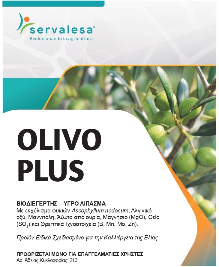 Το OLIVO PLUS είναι Βιοδιεγέρτης - Υγρό λίπασμα με βάση εκχύλισμα φυκιών του Ascophyllum nodosum, Αλγινικό οξύ και Μαννιτόλη, σε συνδυασμό με Άζωτο (προερχόμενο από ουρία), Μαγνήσιο (MgO), Θείο (SO3) και Θρεπτικά Ιχνοστοιχεία (Β, Μn, Μο, Ζn), κατάλληλο για διαφυλλική εφαρμογή.